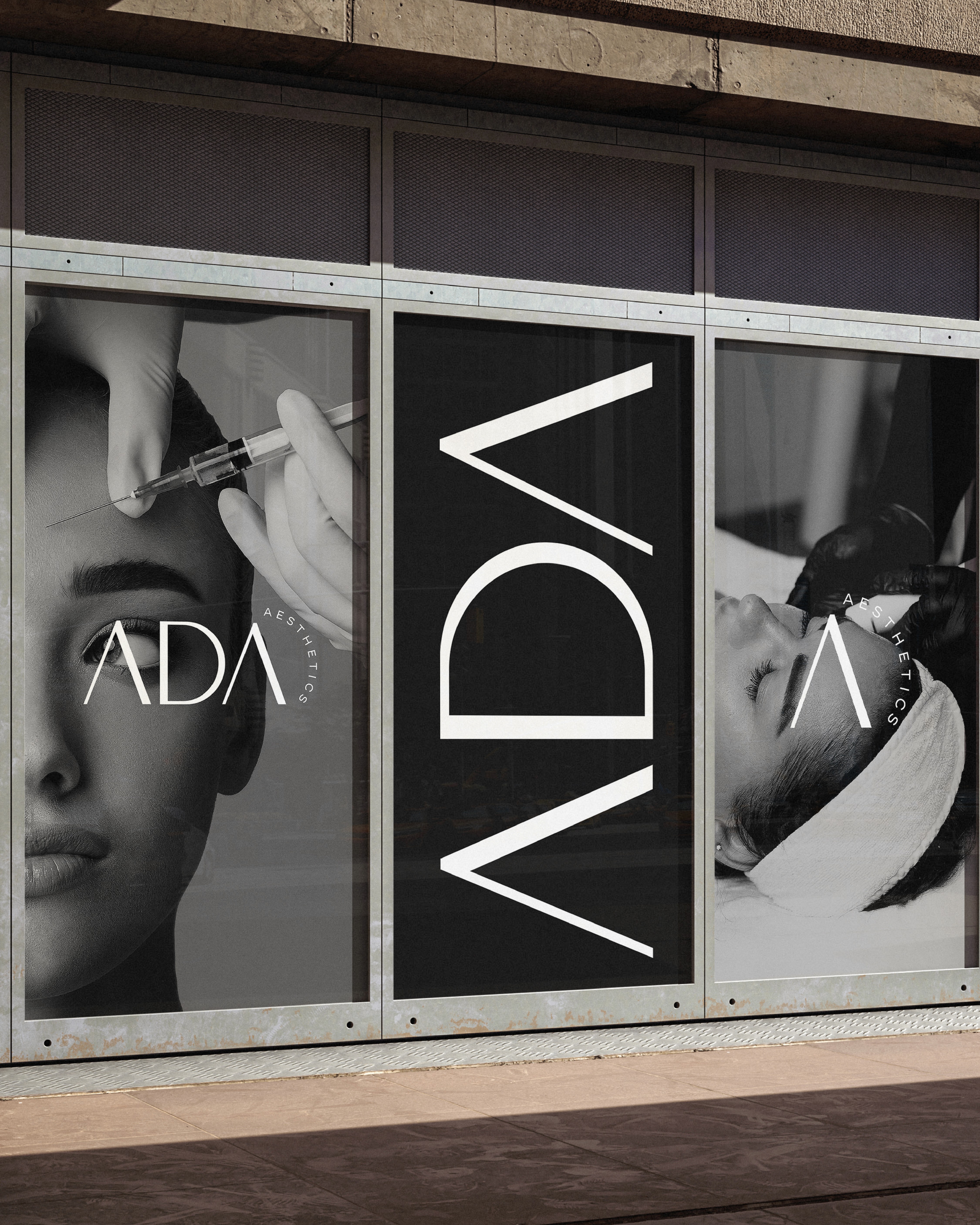 The identity was developed as a system that could translate across real touchpoints, not just mock-ups. On the storefront and window application, the bold scale and minimalist layout gives strong street presence, making the brand recognisable from a distance and legible at a glance. On social, the typography-led layouts allow ADA Aesthetics to communicate treatments clearly, while maintaining a consistent premium look across posts and stories.
